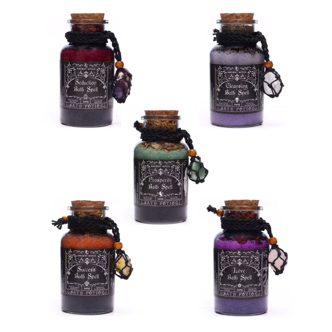 Handcrafted with care, each 240g potion comes in a glass apothecary-style bottle sealed with a cork lid and adorned with an Aventurine crystal amulet tied in black cord. Aventurine is traditionally associated with luck, wealth, and new opportunities – perfect for setting intentions during your self-care rituals.