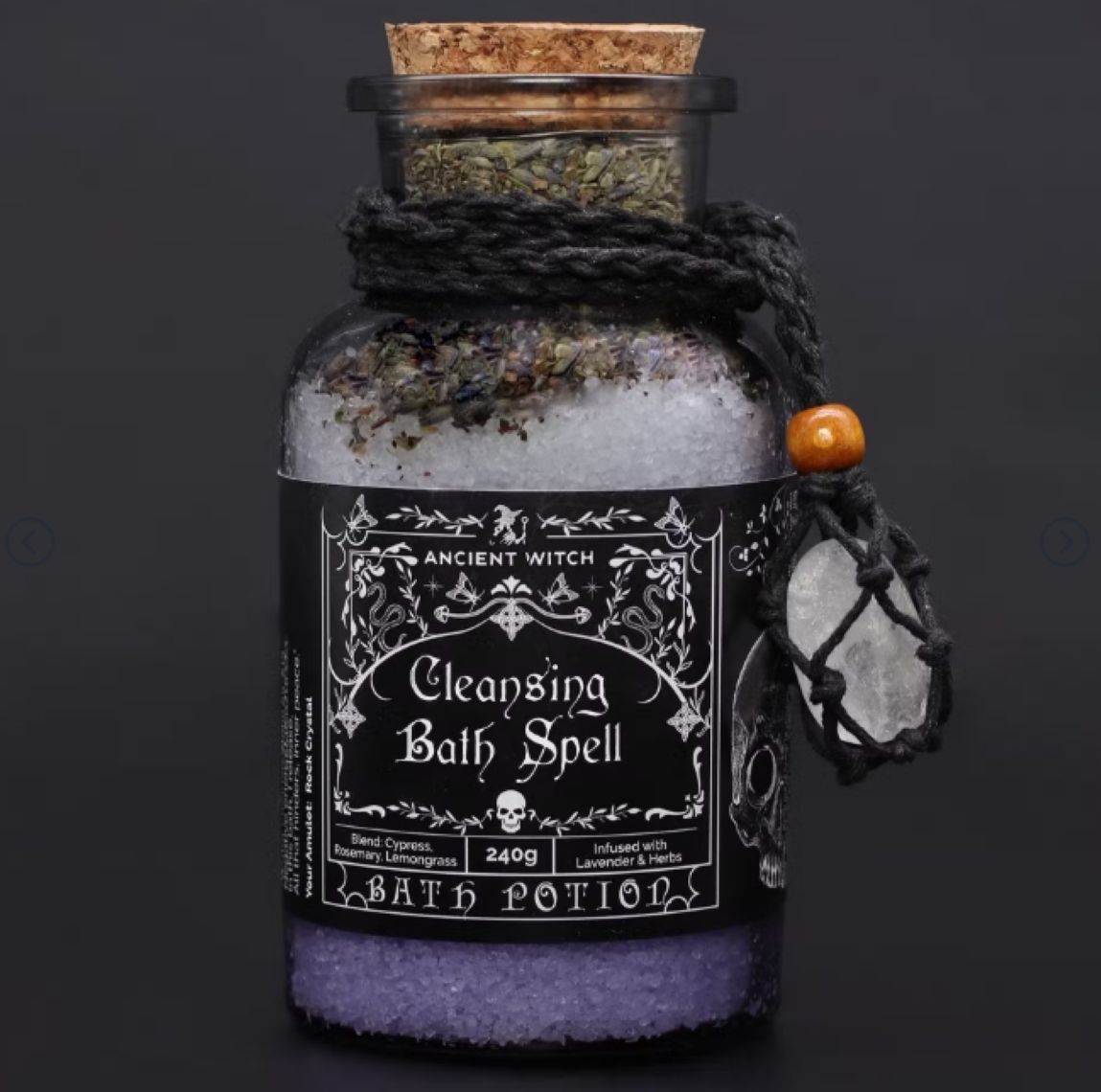 Cleanse your energy and unwind with the Ancient Witch Cleansing Bath Spell Potion. Made with Epsom salt, lavender, and purifying herbs, this potion is infused with essential oils of cypress, rosemary, and lemongrass to promote renewal and inner clarity. Bath salt and natural stone necklace.